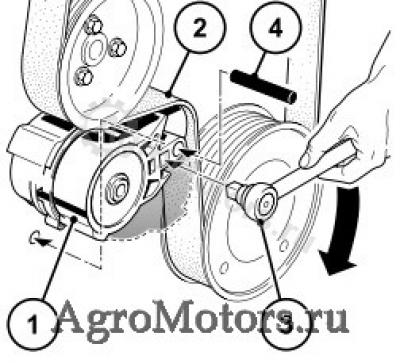 - Нажать натяжной ролик (1) торцевым ключом (3) в направлении стрелки, пока штифтовый ограничитель Ш 6 мм (4) не будет фиксироваться в монтажном отверстии. Теперь поликлиновой ремень (2) ненатянут.